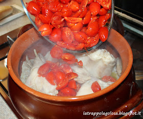 trasferirlo in un tegame di terracotta, sfumarlo con il vino bianco, aggiungere i pomodorini tagliati in quattro